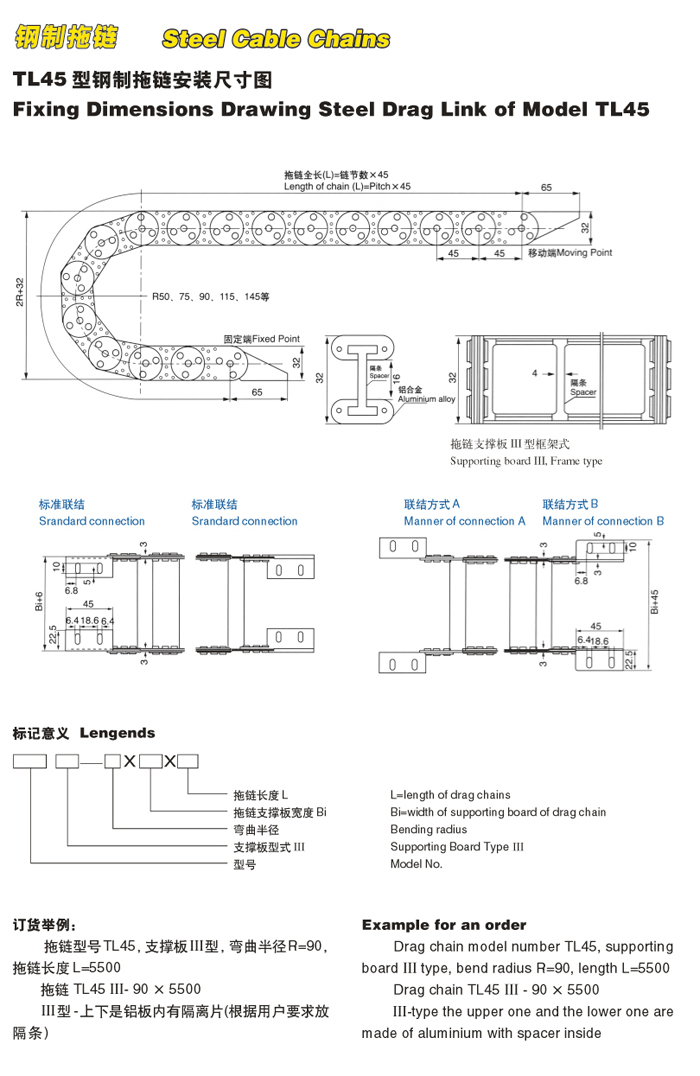 節(jié)距45mm,彎曲半徑有50,75,90,115,145.鏈板高度32mm,拖鏈最小寬度35.內(nèi)高20mm。