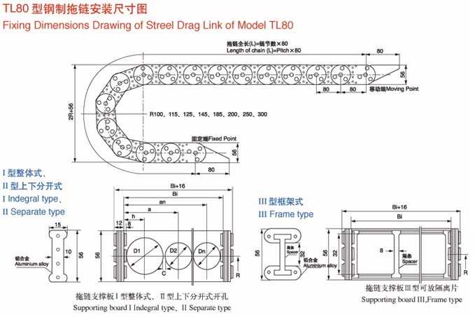 TL80II型鋼制拖鏈:簡介:節(jié)距80mm,彎曲半徑有100,115,125,145,185,200,250,300.鏈板高度56mm,拖鏈最小寬度50mm.最大孔徑35mm。