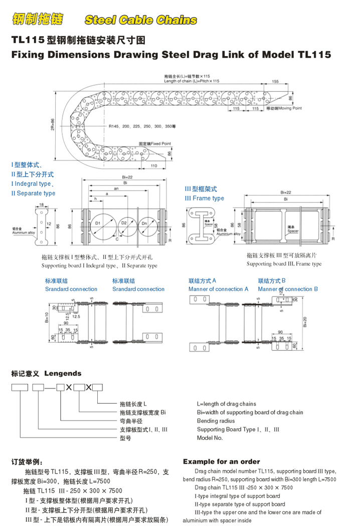 拖鏈型號(hào)TL115,支撐板Ⅲ型,彎曲半徑R=250,支撐板寬度Bi=300,拖鏈長度L=7500